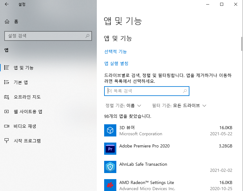 [시작 작업표시줄 - 설정] 앱 및 기능 클릭한다.
